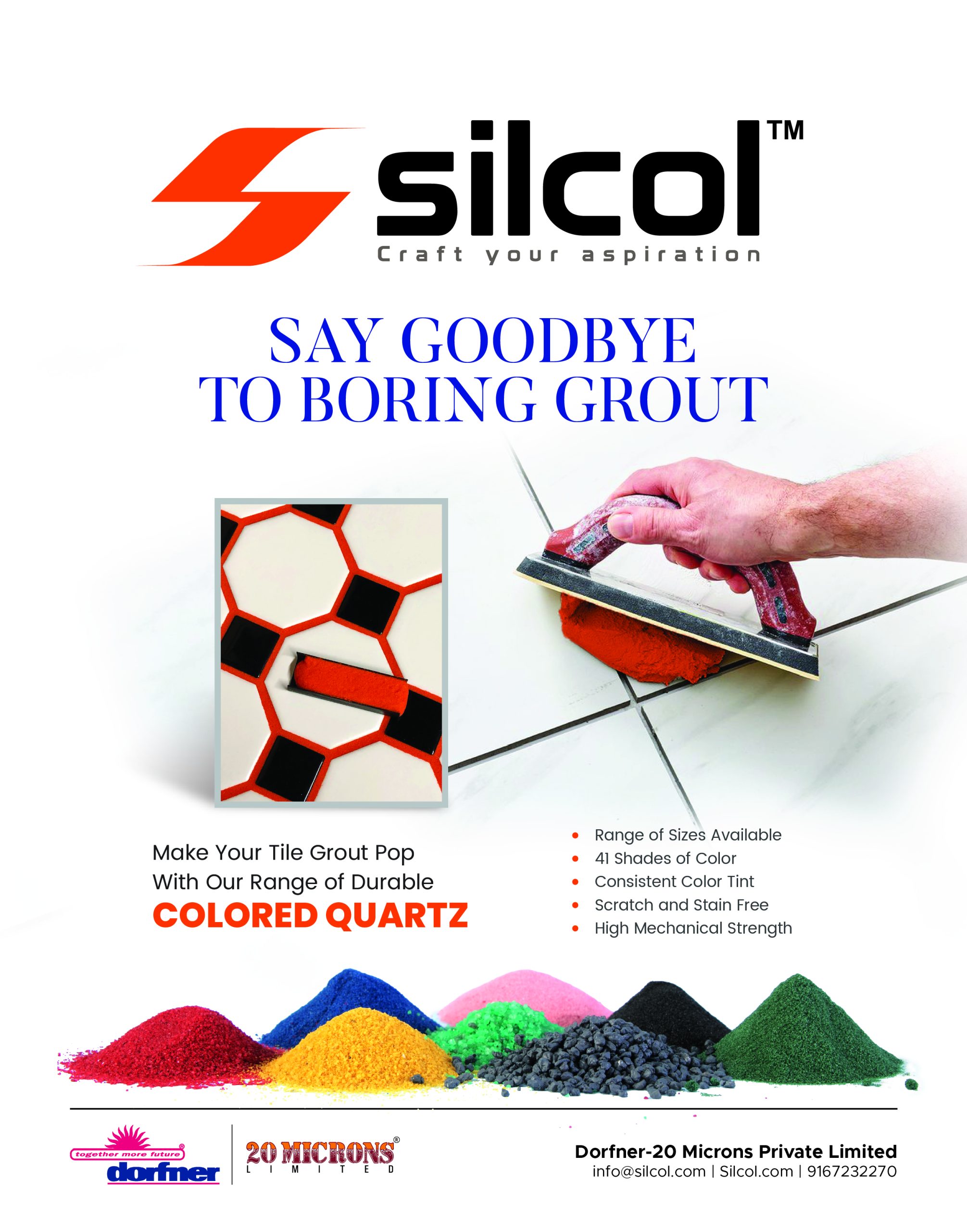 Silcol believes in your craftsmanship to design world-class artistic and highly durable products using Speciality coloured quartz offered by Dorfner-20 Microns Private Limited, a Joint Venture between Dorfner Holding GmbH & Co. KG, Germany and 20 Microns Limited India. With our expertise and decades of experience in the field of mineral technology, and with technological advancements, we have come together to share our irreplaceable product- Speciality Coloured Quartz, for the creative and premium segment. Silcol caters to your creativity as well as technical needs, offering a gamut of shades, shapes and sizes with superior industrial quality for segments like Kitchen Sinks, Tile Grout, Floorings, Textured Coatings, Composites, and other aesthetic applications.