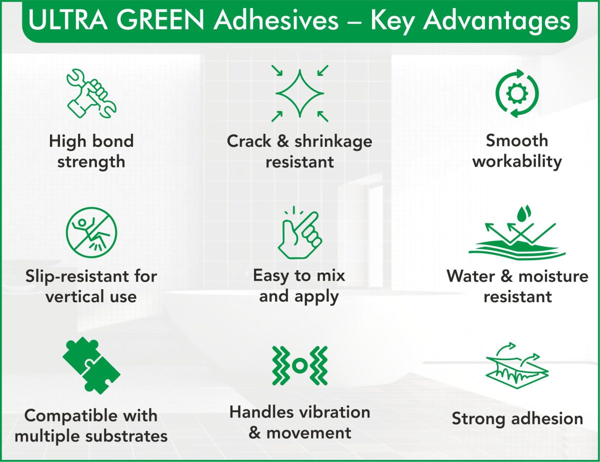 ULTRA GREEN Construction Chemicals, established in 2011, is a trusted manufacturer and supplier of comprehensive construction chemical solutions in India and overseas. The company specializes in a wide range of solutions including adhesives, waterproofing systems, epoxies, admixtures, flooring compounds, and tile & stone care products.